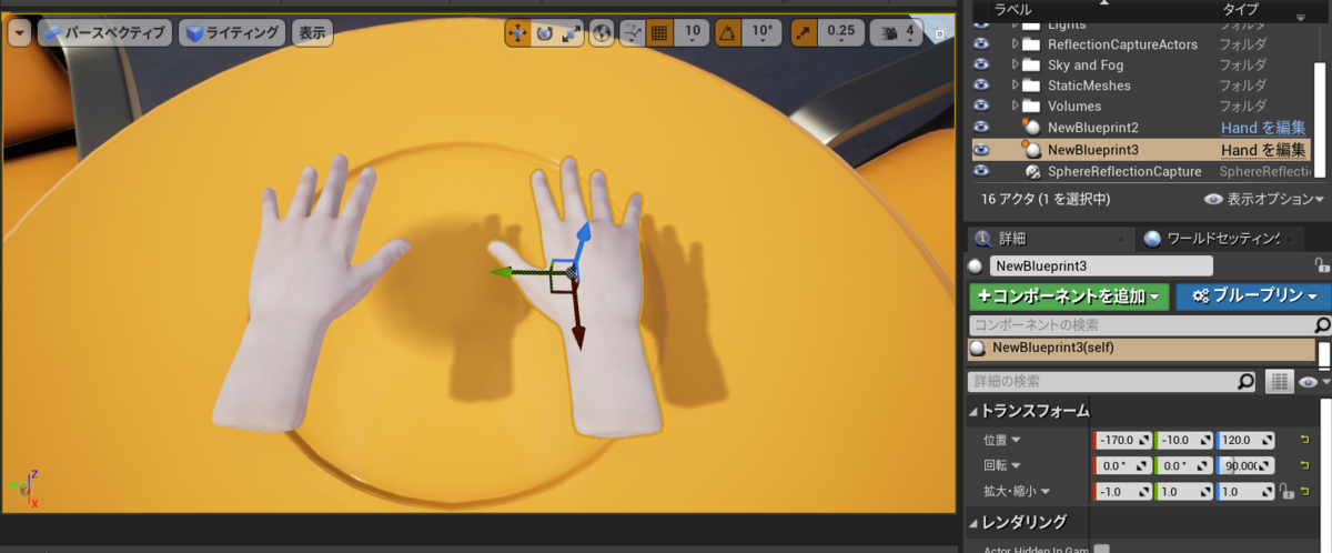2020-08-09 UE4 オブジェクトを反転させるやり方 UE4 備忘録 先日知って、かなり衝撃を受けたので残しておきます。 例えば手のアセットを入れたのはいいけど、両手欲しくなった時。 それ、スケールでできます。 xにマイナス入れるだけ。 知らんかった。。。